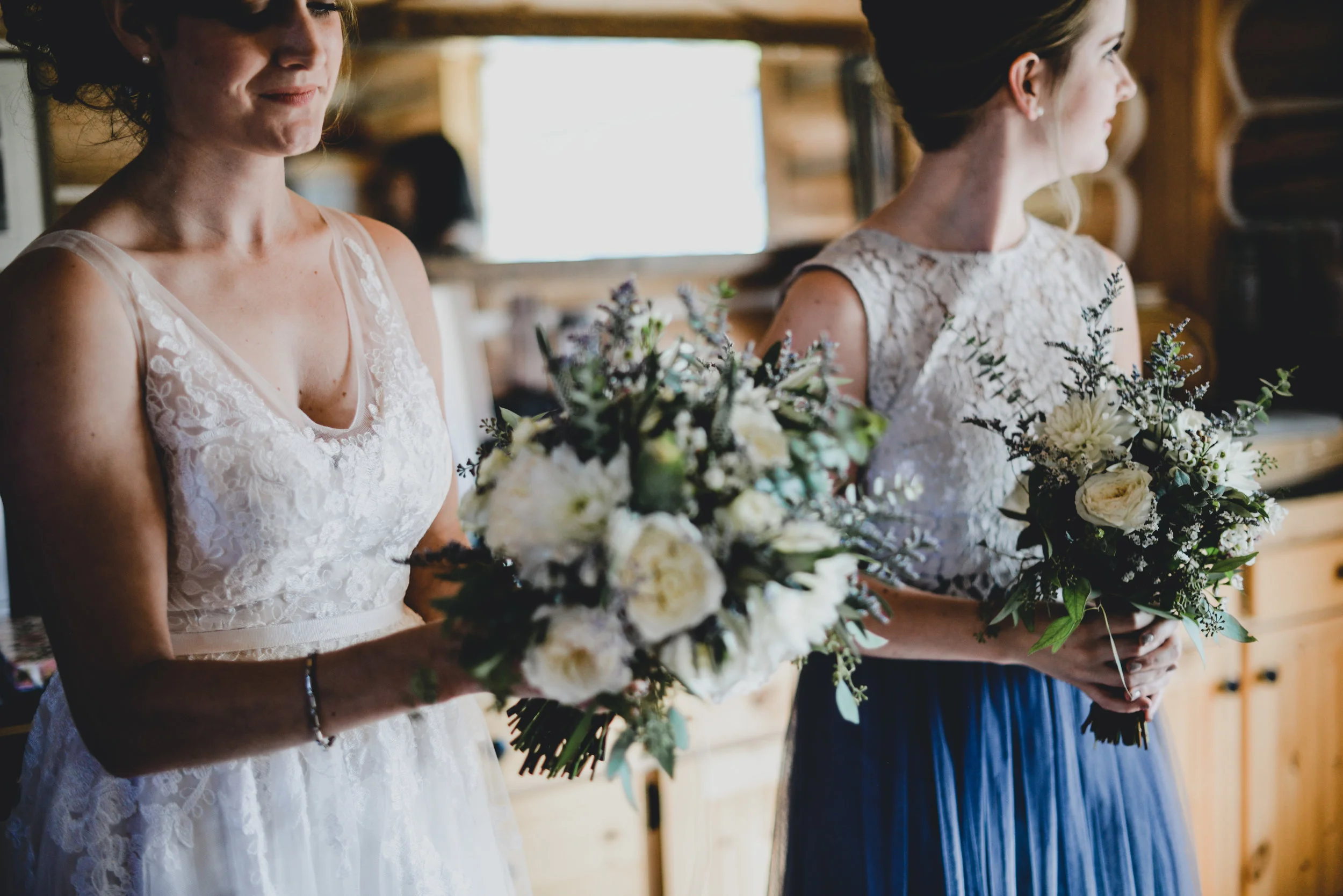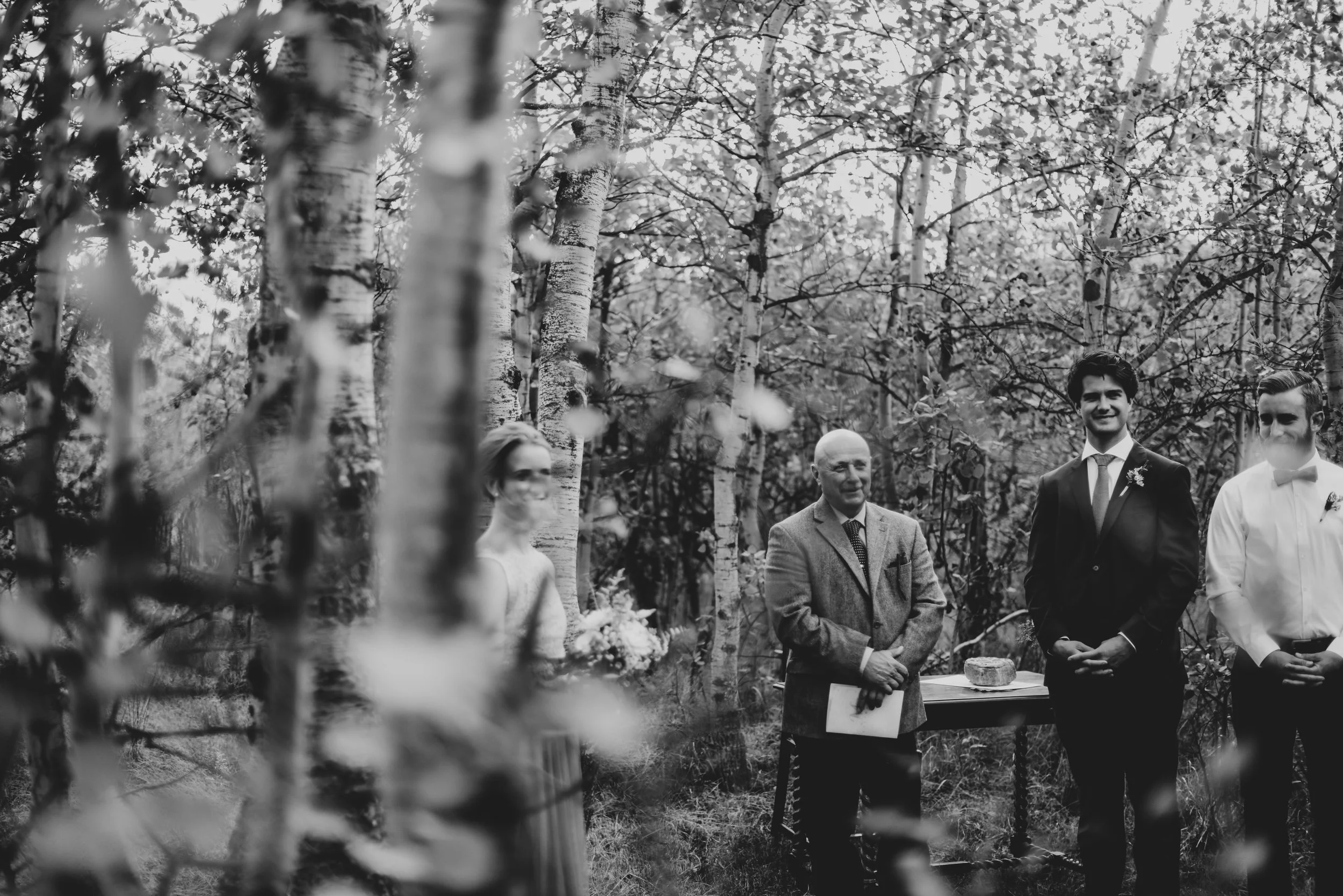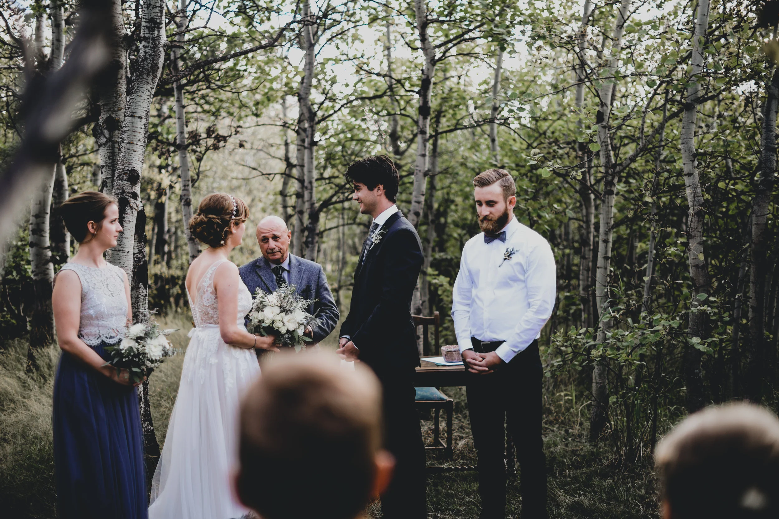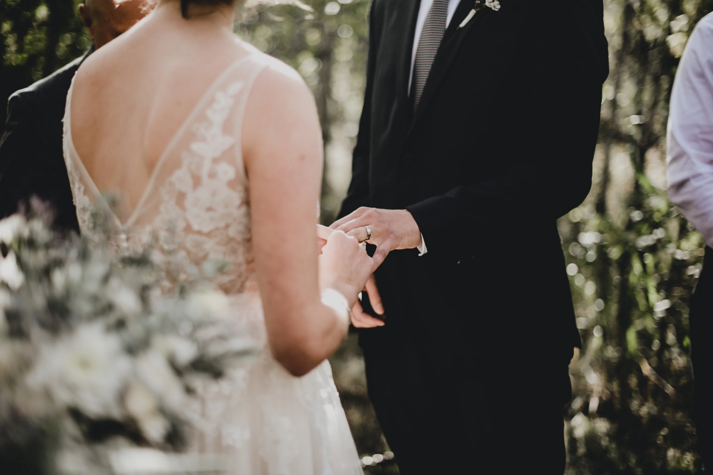 Part one of Mikey + Danielle's wedding was on a sun-kissed Saturday. They found a spot sheltered from the wind in the middle of the forest to say their vows + exchange rings in front of nine of their loved ones. There was a ring warming ceremony + two of their dogs exploring between between the trees + handmade bouquets. After their first kiss as husband + wife + all the hugging that followed, we wandered through the forest + to a clearing with a view of the mountains to take photos. Then they concluded their wedding day with toasts + dinner in their family cabin, sharing food + laughter.
