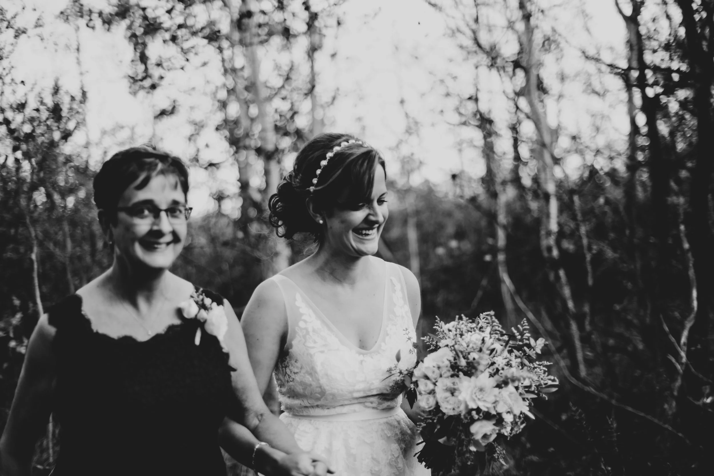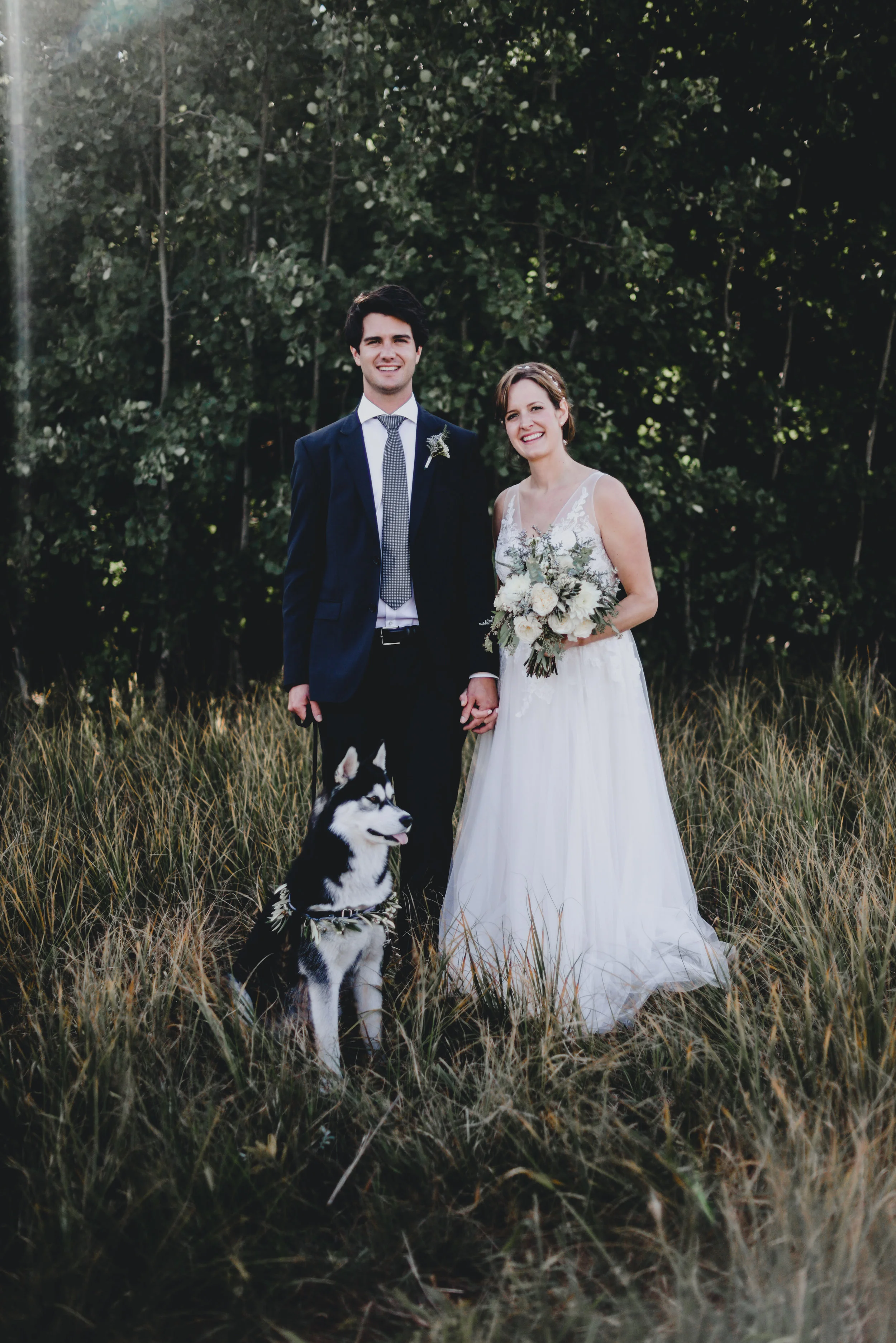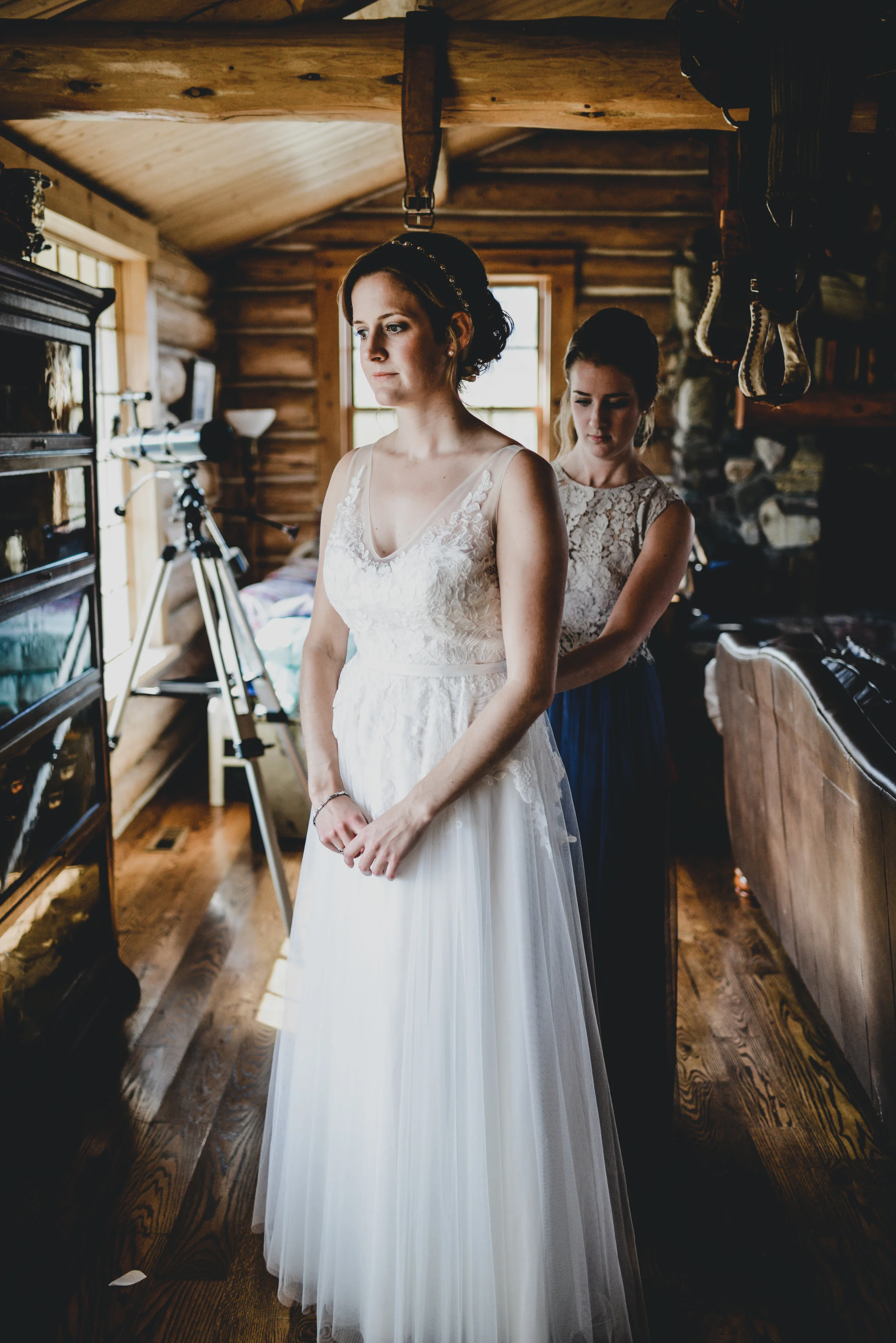 Part one of Mikey + Danielle's wedding was on a sun-kissed Saturday. They found a spot sheltered from the wind in the middle of the forest to say their vows + exchange rings in front of nine of their loved ones. There was a ring warming ceremony + two of their dogs exploring between between the trees + handmade bouquets. After their first kiss as husband + wife + all the hugging that followed, we wandered through the forest + to a clearing with a view of the mountains to take photos. Then they concluded their wedding day with toasts + dinner in their family cabin, sharing food + laughter.